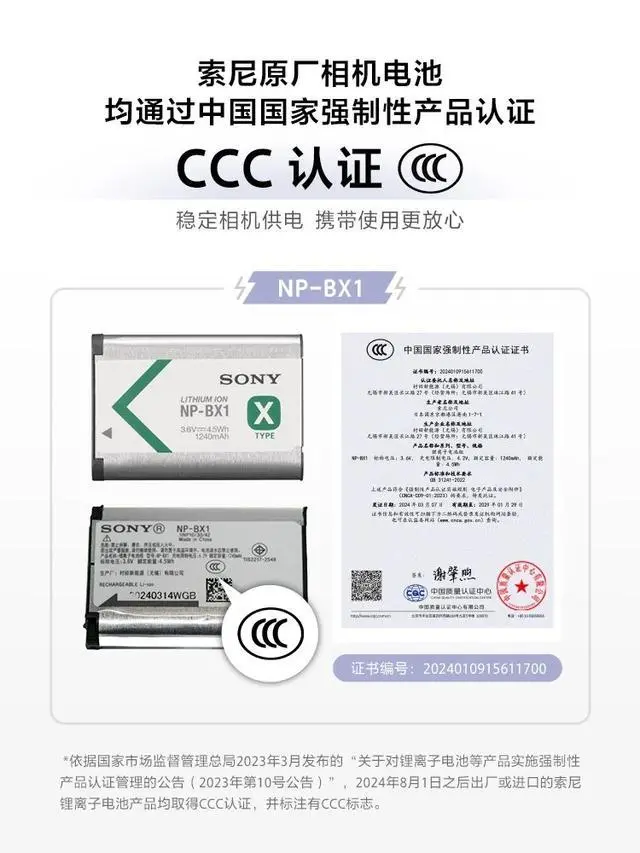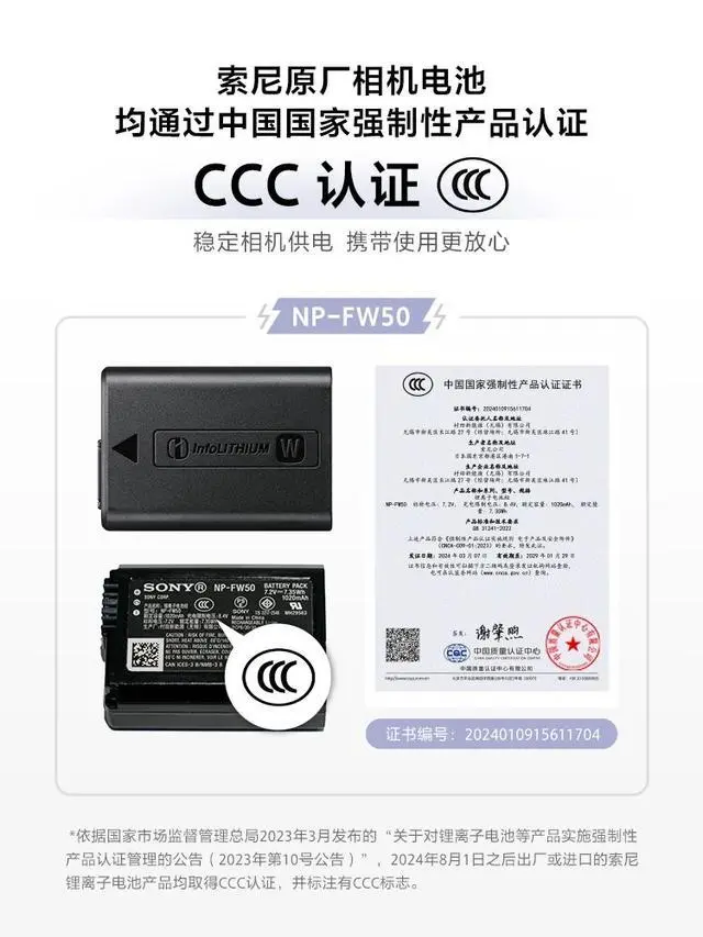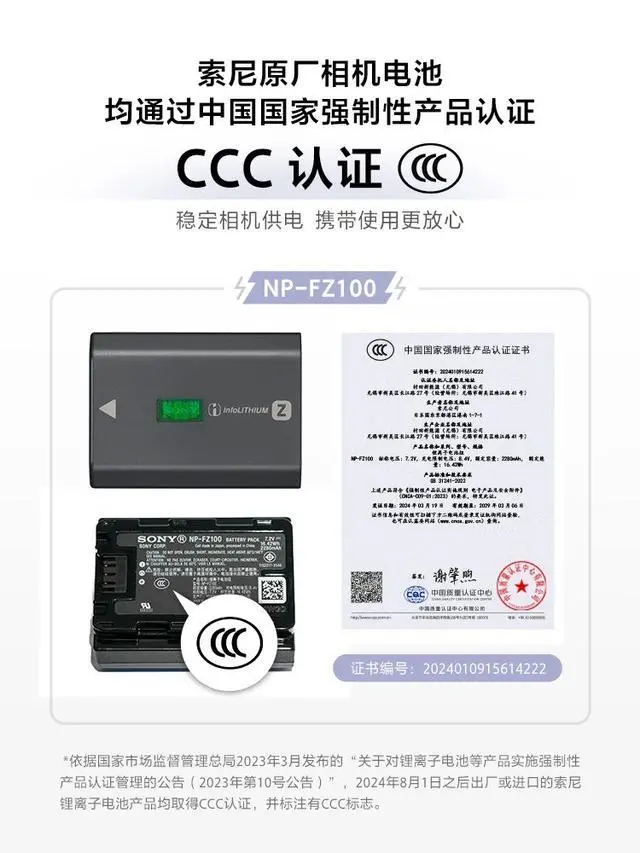 依据国家市场监督管理总局 2023 年 3 月发布的“关于对锂离子电池等产品实施强制性产品认证管理的公告(2023 年第 10 号公告)”,2024 年 8 月 1 日之后出厂或进口的锂离子电池产品均须取得 3C 认证,并标注有 3C 标志。索尼相关产品均已按上述要求已取得 3C 认证,并符合国家相关法律法规及标准。