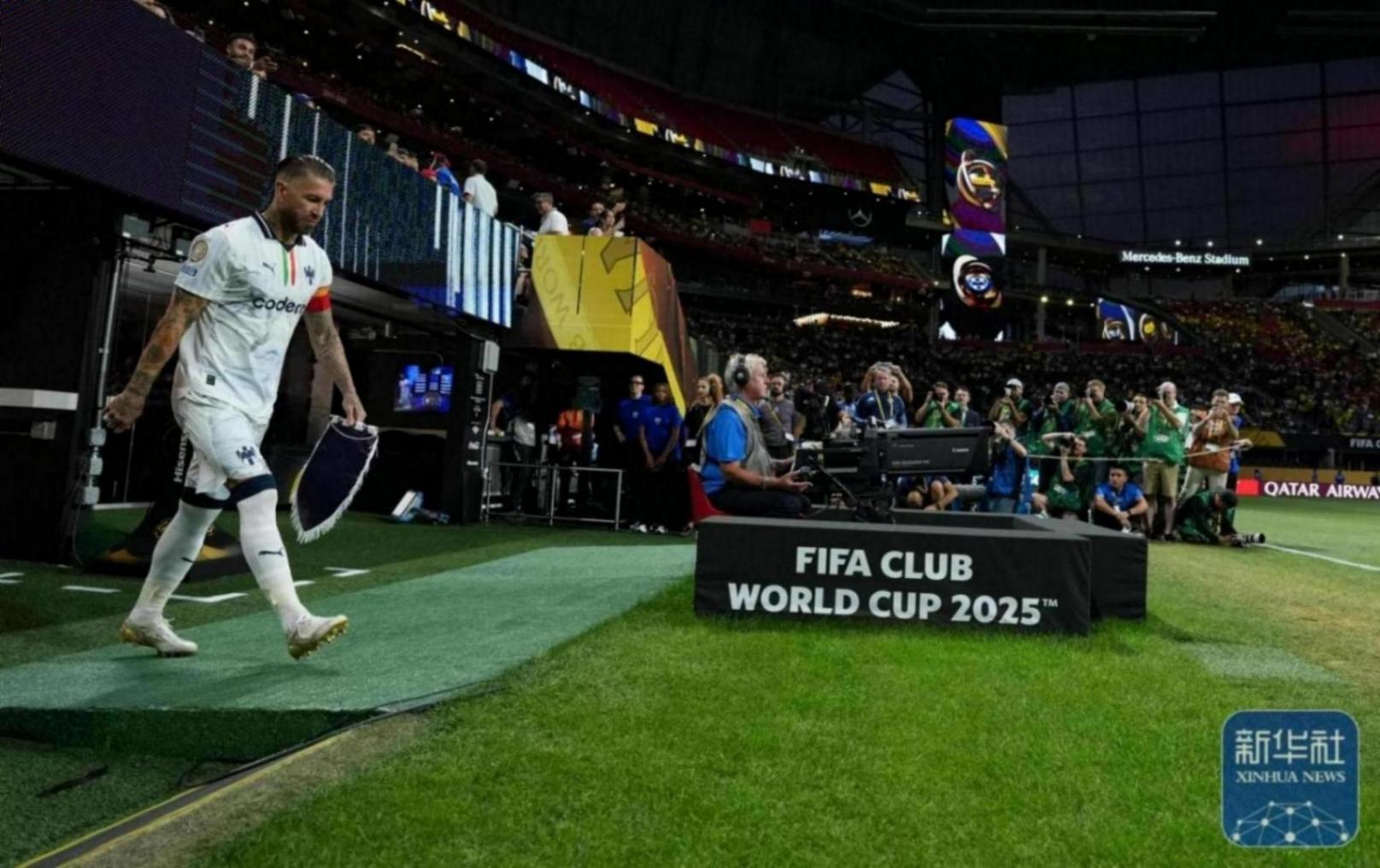 ↑蒙特雷队球员拉莫斯(左)在比赛前入场。新华社记者 黄宗治 摄