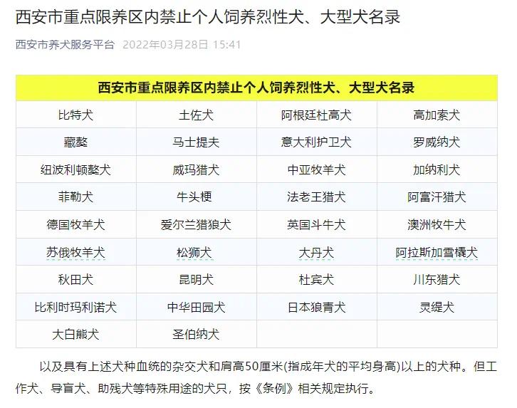 比如,西安自2012年起实施的《西安市限制养犬条例》,将该市划分为重点限养区和一般限养区,重点限养区内禁止个人饲养烈性犬、大型犬,单位饲养或者一般限养区内个人饲养烈性犬、大型犬的,必须实行拴养或者圈养。而中华田园犬被列入重点限养区内禁止个人饲养的烈性犬、大型犬名录。