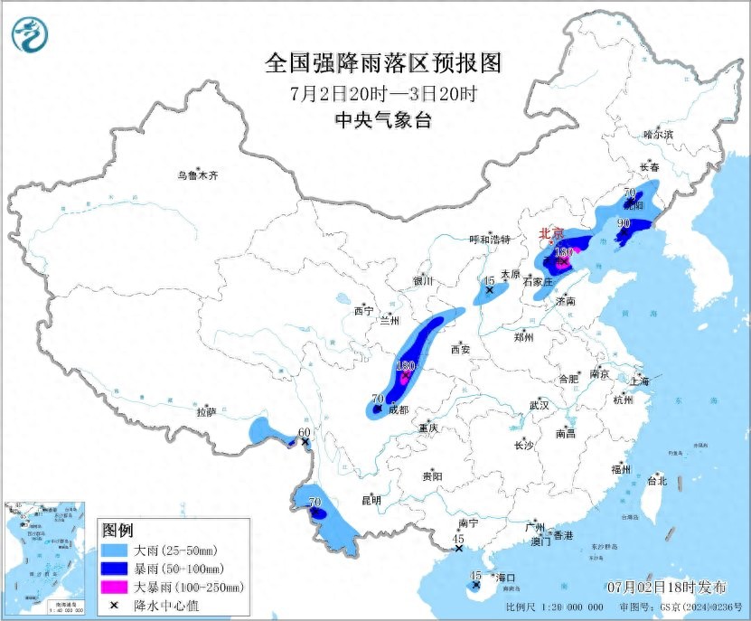 预计,7月2日20时至3日20时,河北中东部、北京东部、天津、山西中部、辽宁大部以及四川盆地西部、甘肃东南部、陕西西南部和北部、宁夏南部、云南西南部、西藏东南部等地的部分地区有大到暴雨,其中,河北东部、天津中东部和南部、四川盆地西北部、甘肃东南部等地的部分地区有大暴雨(100~180毫米)。上述部分地区伴有短时强降水(最大小时降雨量20~50毫米,局地超过70毫米),局地有雷暴大风等强对流天气。