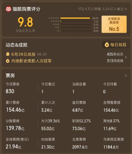 6月30日,据猫眼专业版数据,《哪吒2》在经历密钥延期四次之后,于当日23时59分正式到期,结束在内地院线的上映。电影累计总票房154.46亿元,上映时长153天。