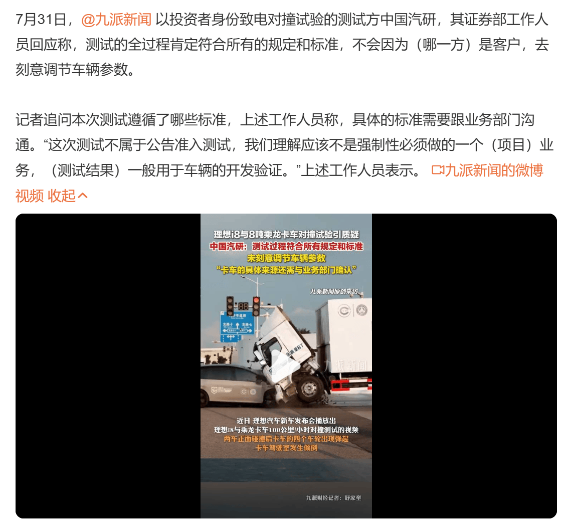 同时,中国汽研也向媒体证实测试“符合所有规定和标准”,但未公开具体执行标准及卡车技术状态细节,并表示“测试不属于公告准入测试”,仅为车辆开发验证用途。