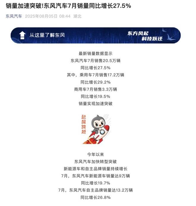 东风汽车在下半年伊始同样加速突破上扬。最新销量数据显示,7月东风汽车销售20.5万辆,同比增长27.5%;其中,乘用车7月销售17.2万辆,同比增长29.2%;商用车7月销售3.3万辆,同比增长19.5%。值得注意的是,东风新能源和自主品牌销量持续攀升,岚图汽车、奕派科技在7月销量增幅均超过9成,猛士科技7月销量增长74.1%。而在出口方面,东风汽车同样保持稳步增长,7月出口达2.16万辆。
