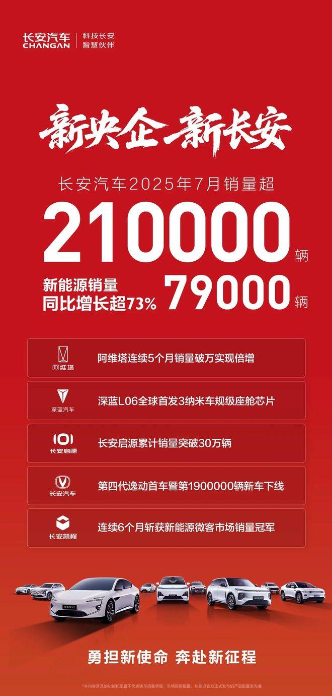 于7月27日成立的第三家汽车央企长安汽车在下半年迎来开门红。公司7月产量达19.59万辆,同比增长34.84%,销量达21.06万辆,同比增长23.43%。自主品牌在7月销量达17.77万辆,同比增长27.69%;新能源汽车7月销量超过7.9万辆,同比增幅高达73%。与此同时,长安汽车旗下品牌已连续5个月实现销量破万,长安启源累计销量也已经突破30万辆,长安凯程已连续6个月斩获新能源微客市场销冠。