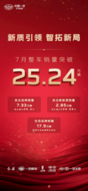 具体来看,中国一汽7月整车销量超过25.24万辆,同比增长6.5%;生产整车达25.36万辆,同比增长11.4%。其中,一汽自主品牌整体销量超过7.33万辆,增幅达29.4%,红旗品牌单月销量突破3.73万辆,同比增长21.1%;自主新能源销量达2.85万辆,同比涨幅高达129.03%。一汽合资品牌则持续领跑合资阵营,一汽-大众7月销量达到11.3万辆,大众品牌整车销量同比增长2.8%;一汽丰田7月销量超6.8万辆,同比增长3%。