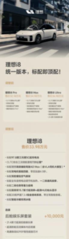 8月5日午间,理想汽车发布公告:将原来的Pro、Max、Ultra三个版本统一为一个版本,之前的顶配配置现在变成标配,售价也改为33.98万元。之前需要额外付费加装的铂金音响也直接标配,并且新增了后舱娱乐屏套装为选装,价格为1万元。