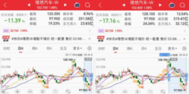 而就在理想i8官宣调整款型后,理想汽车的股价就由跌转涨,一度拉升了5个点左右,随后又一路走低,这足以反映出投资者对理想i8以及理想汽车未来发展的担忧。