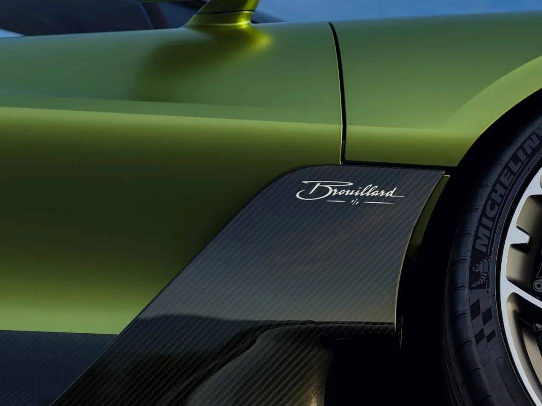 车身侧面,宽大的前后翼子板、凌厉的车门筋线以及经典的“C字”轮廓均与Mistral一脉相承。前翼子板与车门接缝处增设了大型碳纤维端板,并镌刻“Brouillard”专属铭牌。轮毂则采用五辐马蹄造型设计,呼应车型命名背后的赛马主题。