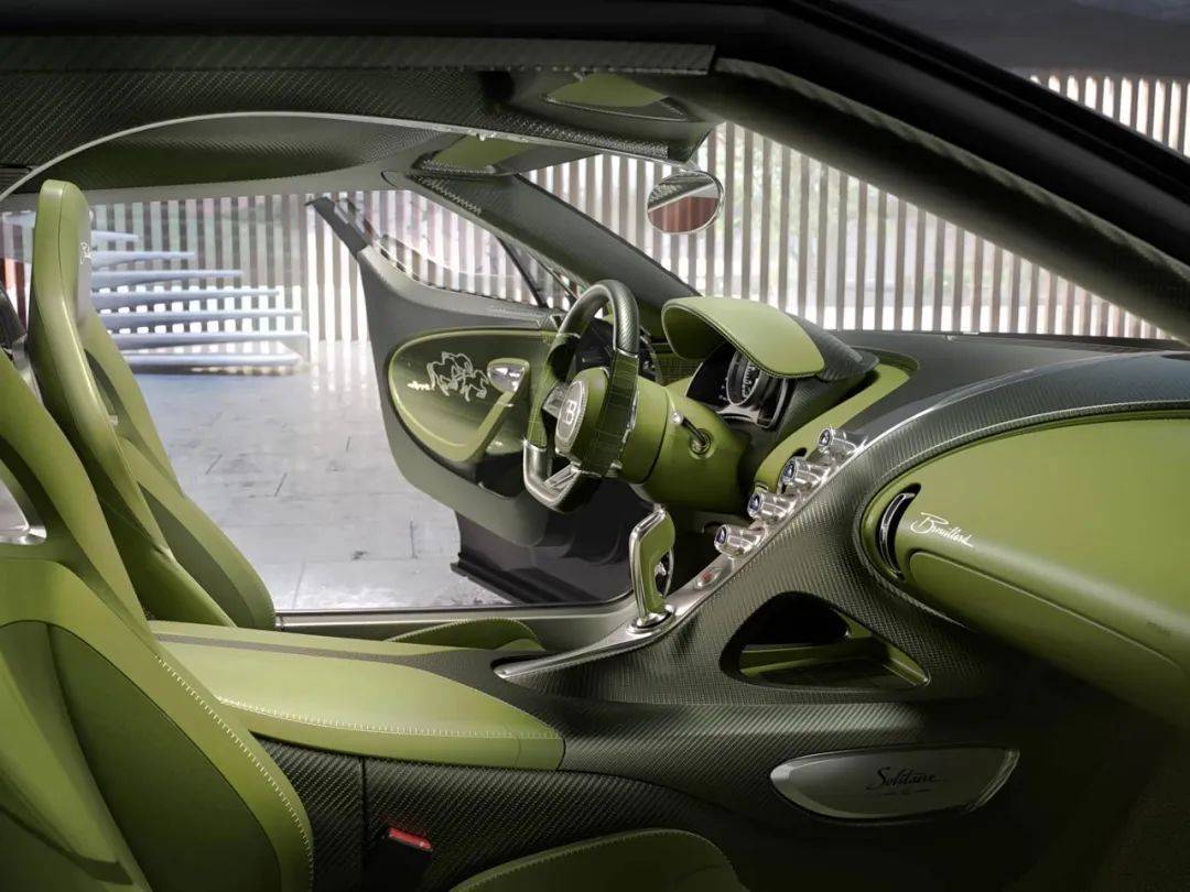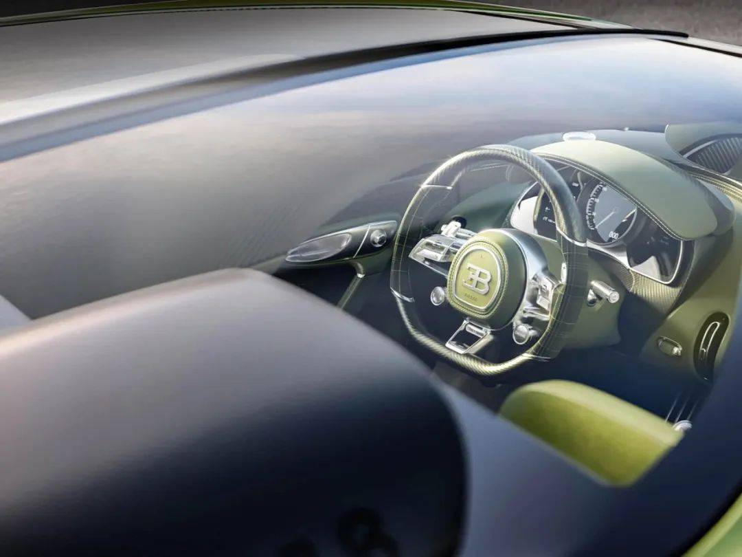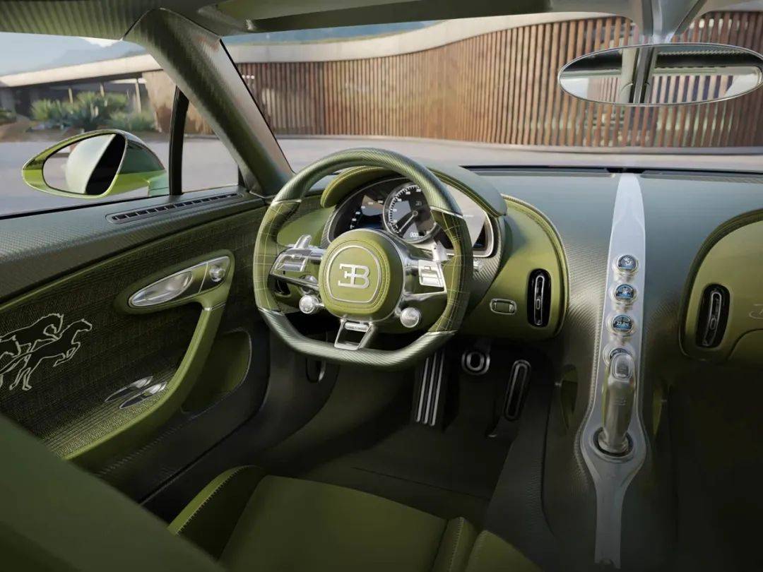 Brouillard的内饰堪称移动的艺术殿堂。三辐式方向盘以绿色碳纤维装饰,并在握把处点缀格子布材质;中控台与车门饰板大面积采用绿色碳纤维与高级皮质拼接;座椅与门板上则精致刺绣着Ettore Bugatti挚爱骏马的形象,再次强化主题。
