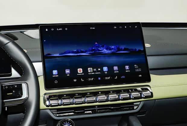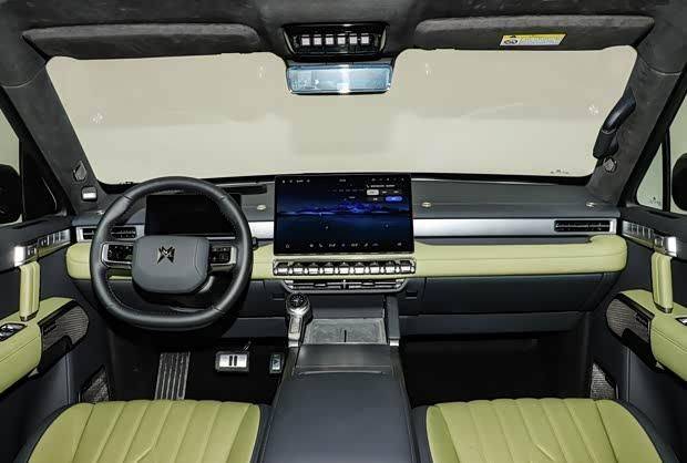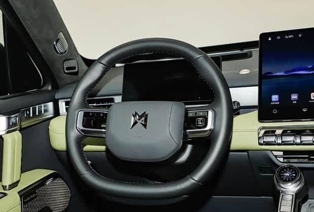 内饰方面,猛士M817提供三种配色方案,整体设计简洁大气。双辐式多功能方向盘搭配悬浮式中控大屏,下方还保留了钢琴式物理按键,兼顾科技感与实用性。副仪表台区域配备了无线充电、钟表等配置,提升了使用便利性。
