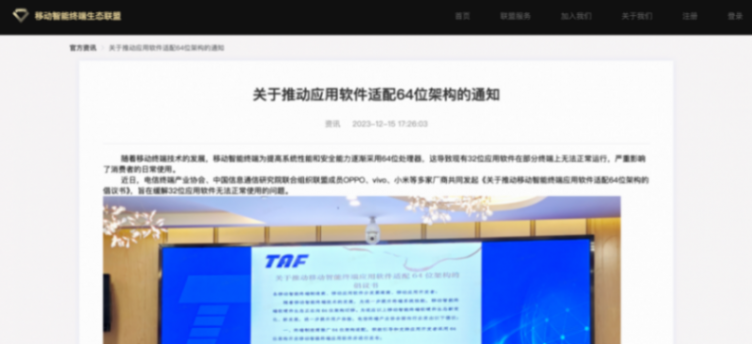 据悉,早在2023年12月移动智能终端生态联盟就发布过《关于推动应用软件适配64位架构的通知》。