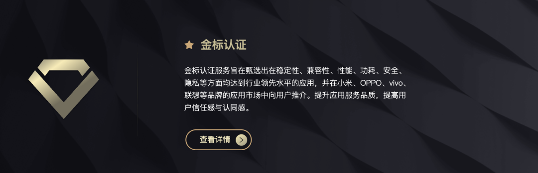 根据官方介绍,通过金标认证,表示应用在各指标和要求上达到行业标准,并处于领先地位;表示其安全与隐私完全遵循相关标准;将有机会获得应用商店的优先推介,获得更多曝光和流量;将优先获得系统服务能力的支持,能够优先适配新系统性能;在生态建设方面能够优先获得参与资格,并扮演重要角色。
