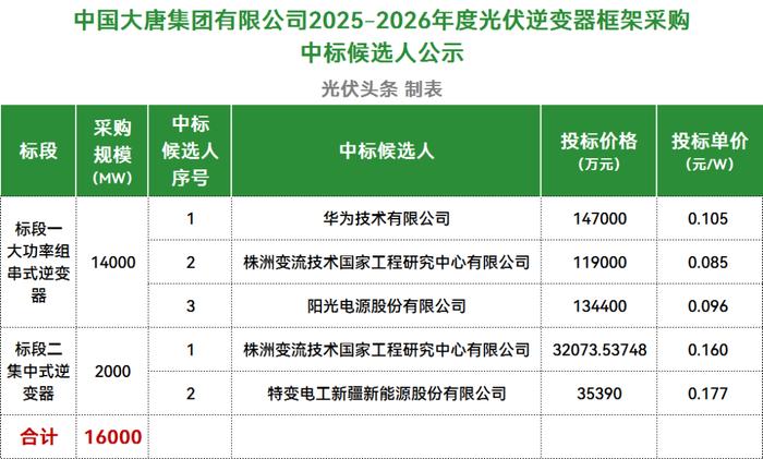 6月18日,中国大唐集团有限公司2025-2026年度光伏逆变器框架采购中标候选人公示。