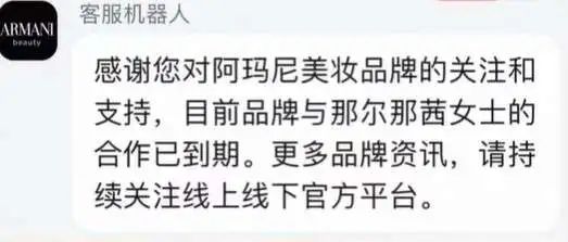 目前,阿玛尼品牌客服回应称“与那尔那茜女士的合作已到期”。