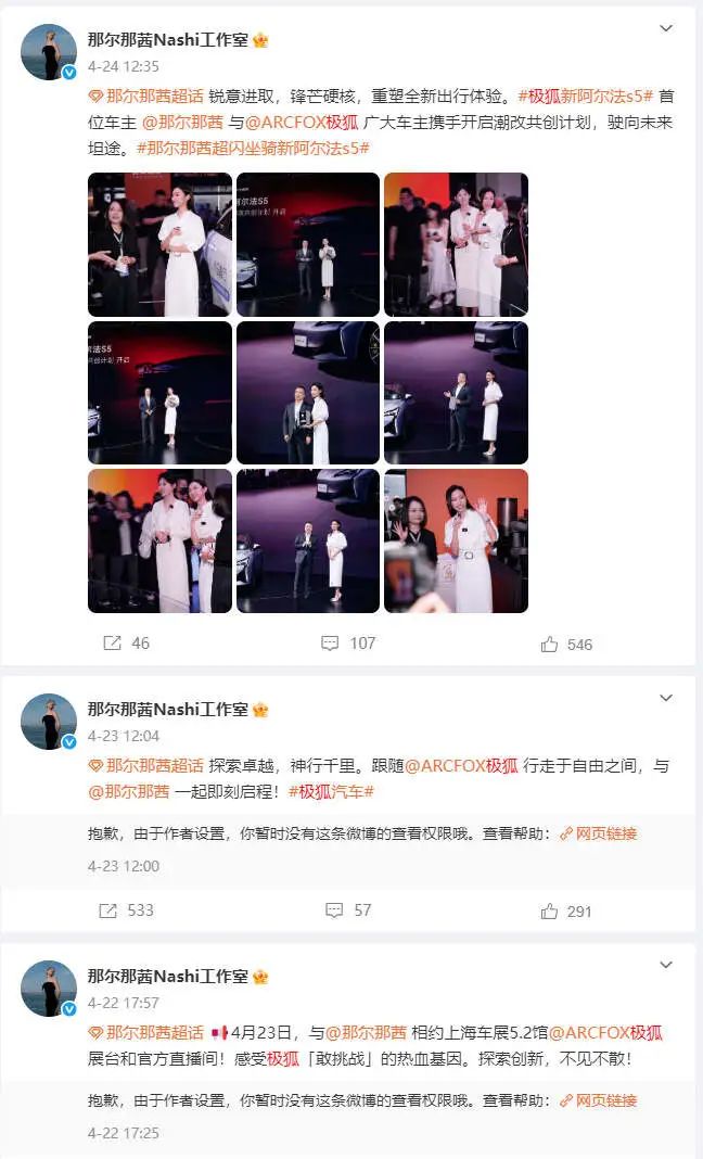 有网友发现,那尔那茜个人和工作室的两个微博账号发布的信息中,有多条疑似与品牌方合作的商业性宣传内容,涉及品牌类型有汽车、奢侈品、牛奶、运动服饰、茶饮等。