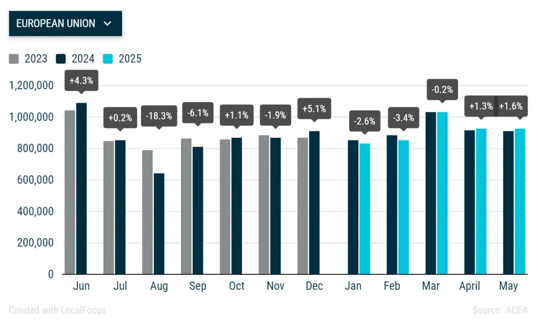 整体市场规模方面,2025年前五月欧盟新车注册量同比微降0.6%,但5月单月凭借1.6%的逆势增长实现回暖,反映出车企促销策略与供应链改善初见成效。