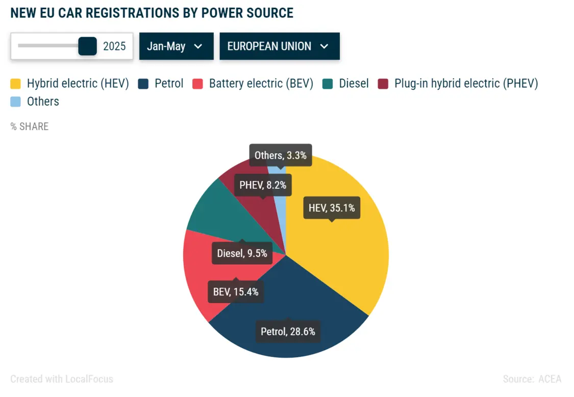 6月25日,欧洲汽车制造商协会发布最新数据显示,截至2025年5月欧盟汽车市场呈现“冰火两重天”格局:电池电动汽车(BEV)市场份额仅15.4%,而混动汽车(含HEV、PHEV)占比高达43.3%,牢牢占据主导地位。