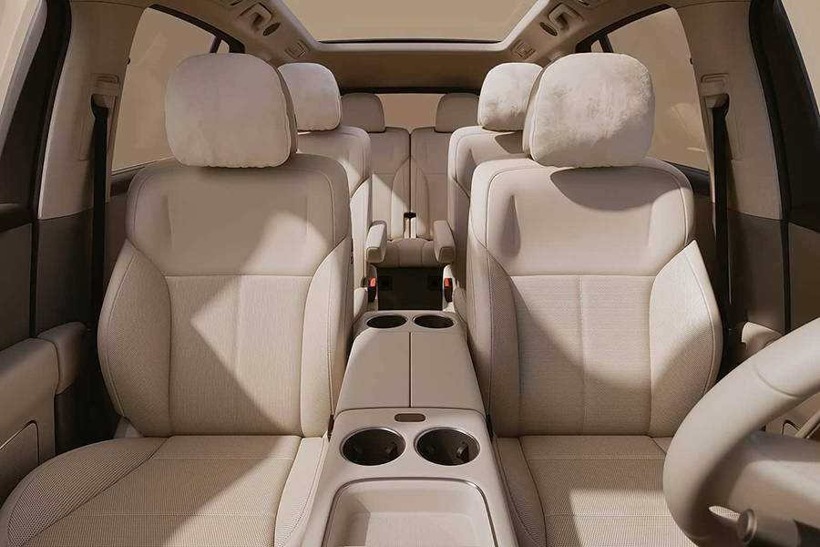 从第二排座椅图片来看,其采用2+2+2的座椅布局,并配备车内氛围灯、全景天幕以及疑似二排隐私帘,同时,其门板处设有尺寸较大的储物槽,满足二三排乘客的储物需求。