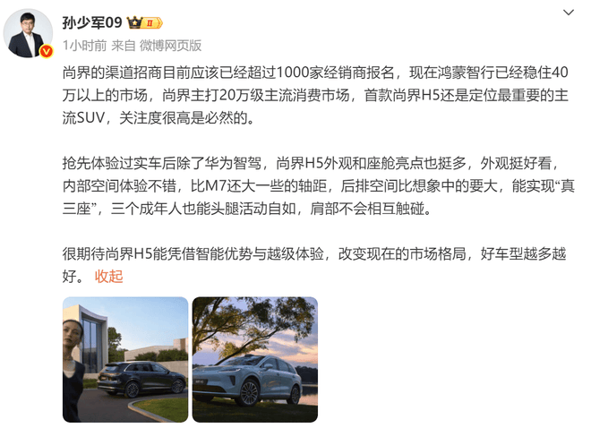 除此之外,尚界的渠道招商目前已有超过1000家经销商报名,主打20万级主流消费市场。