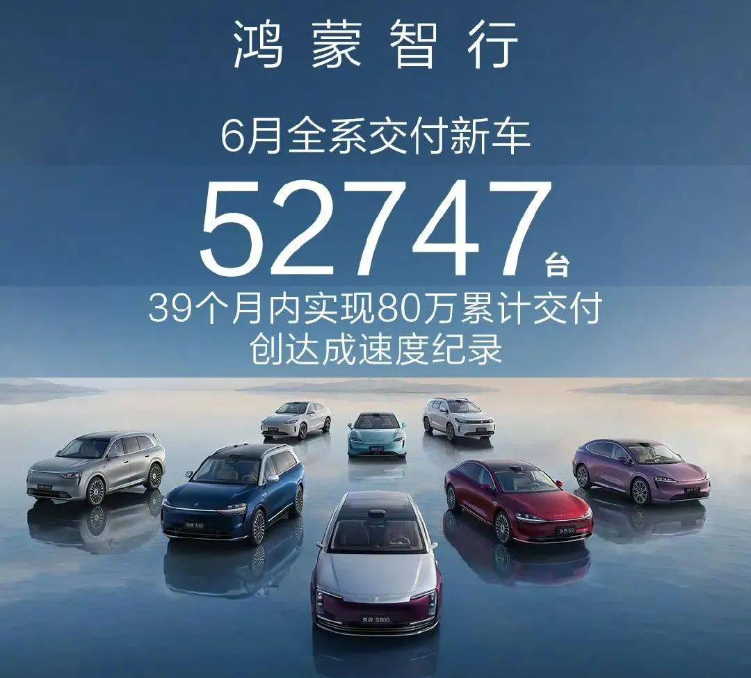 当然,鸿蒙智行也公布了今年6月份的销量数据:52747辆。据说刷新了记录,当然,这一销量数据也超过了零跑汽车,仅次于吉利银河,所以销量还是非常亮眼的。也有人统计了其2025年上半年累计销量,为215064辆,略低于零跑,但仍然可观。