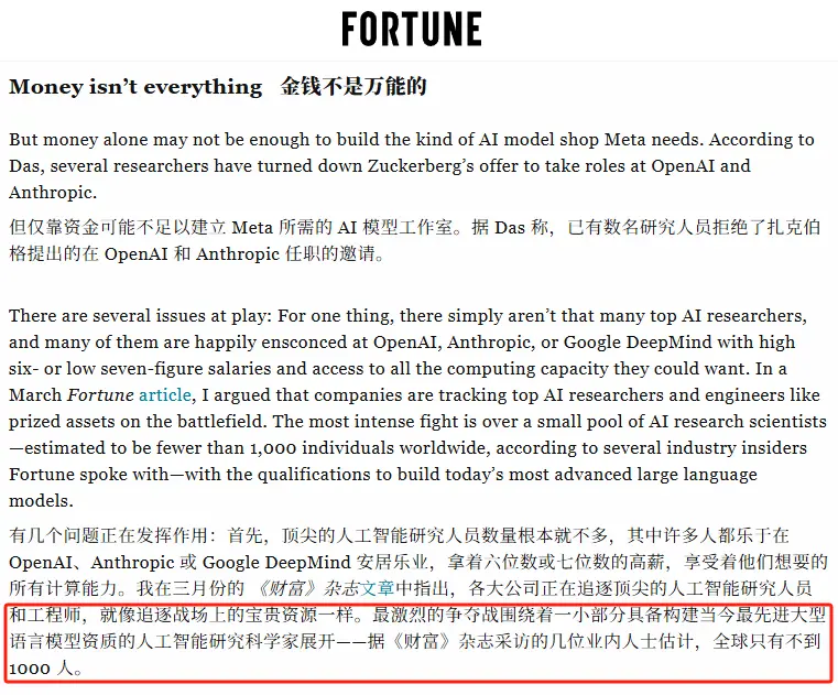 《财富》杂志就曾采访过业内人士,他们提到,全球能真正推动大模型前进的顶尖AI专家,加起来还不到1000人。