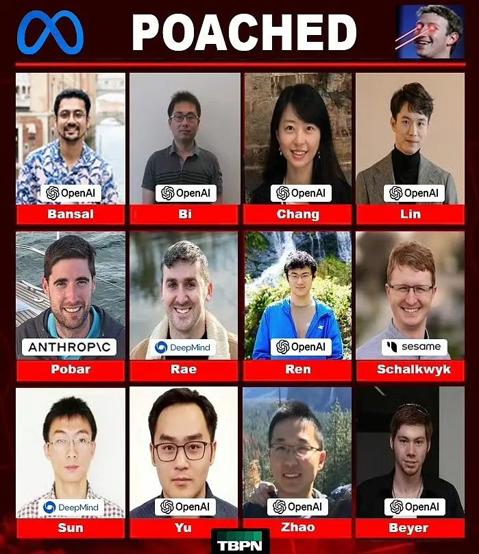 其他公司可就有福了,OpenAI、DeepMind、苹果这些公司的核心人员,都遭遇了Meta的大手。
