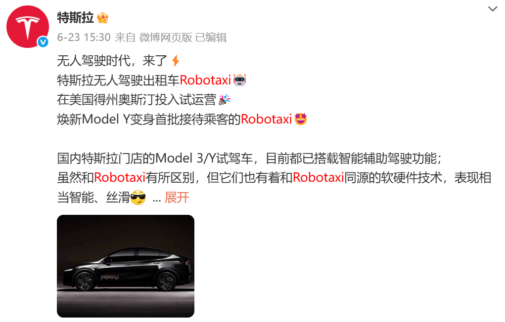 而到了去年,特斯拉公布了其Robotaxi无人出租车业务的计划,并且最近在得克萨斯州上线了这一服务,虽然副驾驶仍然有安全员,且时间线上明显落后于中美其他的无人出租车公司,但也仍然得到了媒体更多的关注,被认为是改变世界的创举。