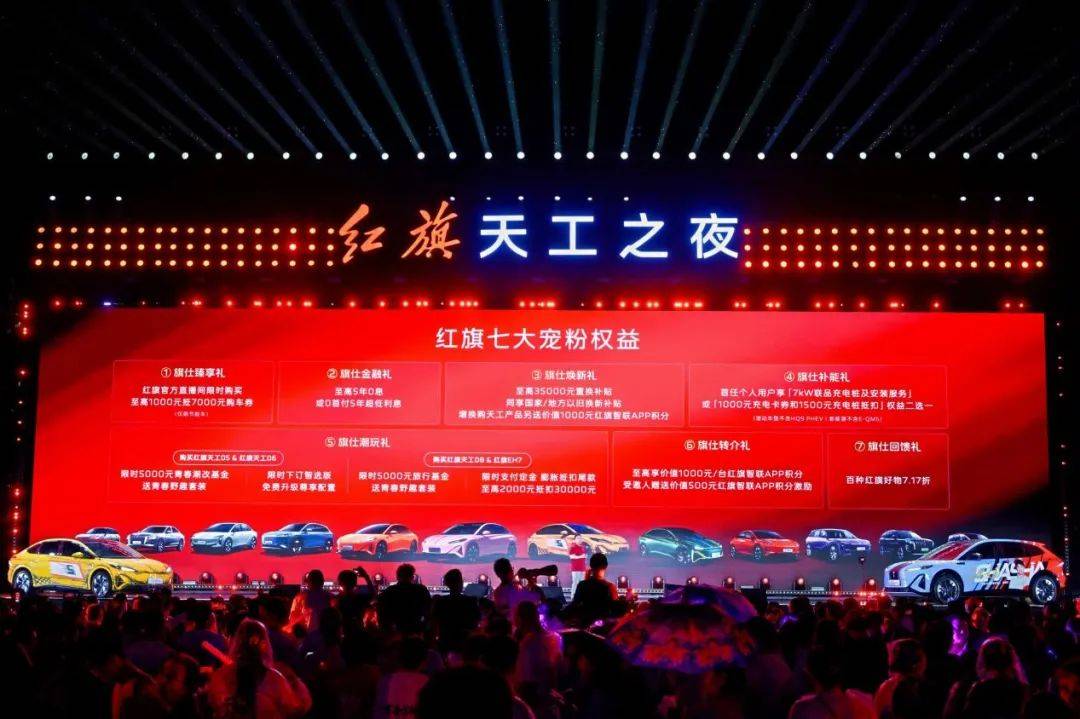 盛典上,中国一汽总经理助理、红旗品牌运营委员会副总裁柳长庆发布了七重“宠粉好礼”:膨胀金礼方面,新用户于红旗官方抖音直播间购入1000元抵7000元购车券,限时享7倍膨胀;金融无忧礼提供购车享至高5年0息,或0首付+5年超低利息的方案;置换焕新礼中,红旗车主置换新车至高享35000元补贴(同享国/地补),增换购天工产品额外赠1000元积分;充电无忧礼为新能源用户提供7kW充电桩及安装服务,或1000元充电卡券+1500元充电桩抵扣券(二选一);旗仕推荐礼设置车主成功转介新车主至高获1000元/台积分激励;智联好物礼推出红旗智联APP限时百种好物7.17折优惠;旗仕潮玩礼则针对不同车型定制福利,购天工05/06享5000元青春潮改基金,智选版免费升级至高16000元尊享配置;购天工08/EH7赠5000元旅行基金+2000元定金至高抵30000元尾款,且以上四款车型均赠青春野趣套装。