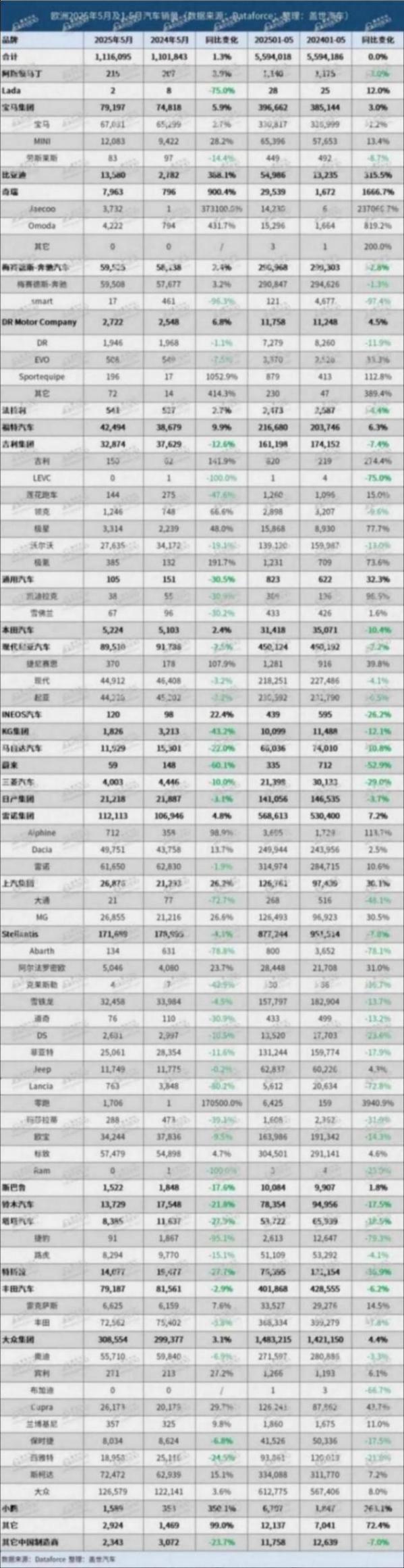 根据欧洲市场研究机构Dataforce最新公布的数据,与去年同期相比,今年5月,欧洲(包括欧盟、英国及欧洲自由贸易联盟国家)汽车销量小幅上升1.3%,至1,116,095辆。