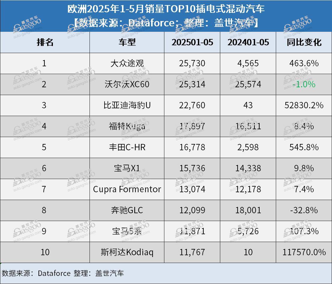 其中,插电式混合动力汽车的销量同比增长了46%,达到108,497辆。在此之中,中国汽车品牌的插电式混合动力汽车贡献了13,040辆的销量,同比暴涨874%,主要由于欧盟对中国纯电动汽车加征关税,迫使中国品牌转向插电式混合动力汽车和混动汽车。就车型而言,比亚迪的海豹 U以6,492辆的销量在该细分市场排名第一,其次是大众途观和沃尔沃XC60。就前五个月累计销量来看,比亚迪海豹U则排在第三。