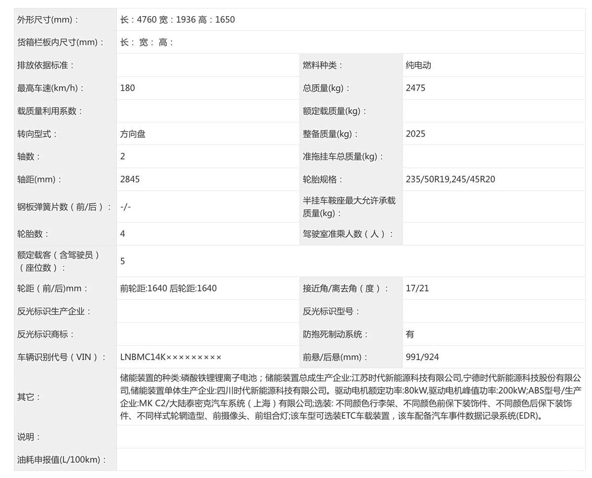 动力方面,与现款车型保持一致,电机最大功率200千瓦,搭载由宁德时代提供的磷酸铁锂电池,最高车速180km/h。