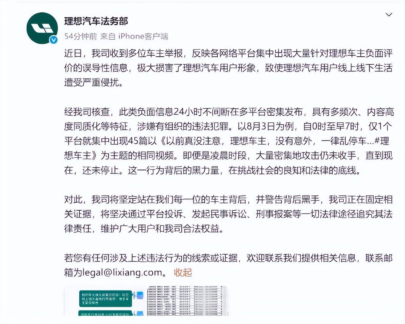 8月7日,理想汽车法务部发布声明称,经核查,此类负面信息24小时不间断在多平台密集发布,具有多频次、内容高度同质化等特征,涉嫌有组织的违法犯罪。