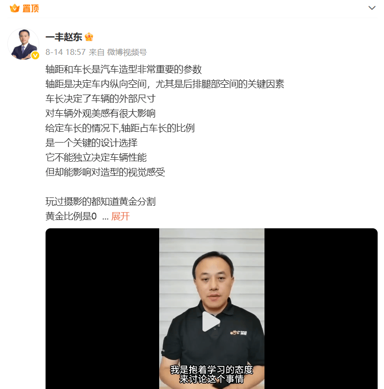 8月15日,一汽丰田汽车销售有限公司企划部部长赵东在置顶微博视频中态度转变:“我之前说轮轴比、轮高比这些参数是小米定义的,有人拿我的话攻击小米夸大宣传,这不是我的本意。”