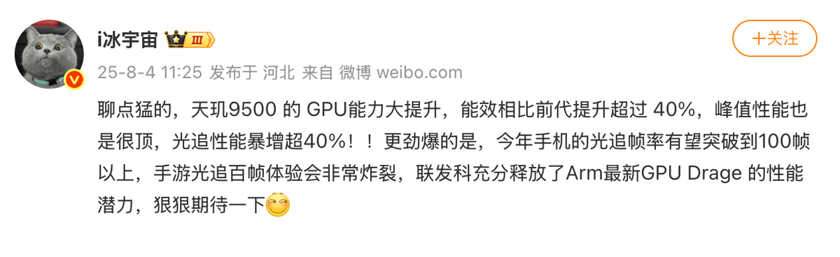 据微博@i冰宇宙爆料,天玑9500的GPU能力大提升,联发科充分释放了Arm最新GPU Drage的性能潜力,能效相比前代提升超过 40%,光追性能暴增超40%。得益于此,手机的光追帧率有望突破到100帧以上,达到光追百帧体验,手机图像性能将进入新的维度。